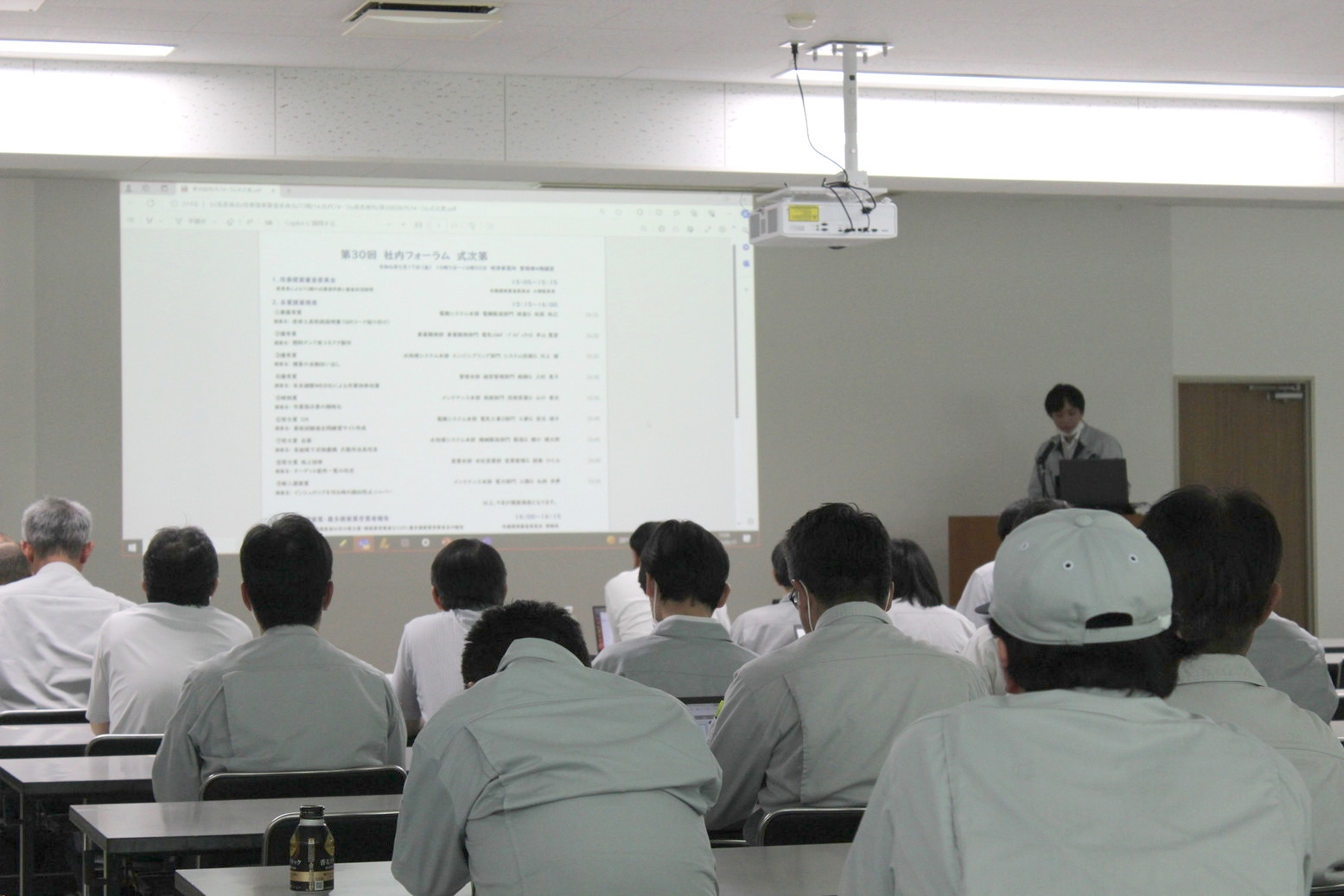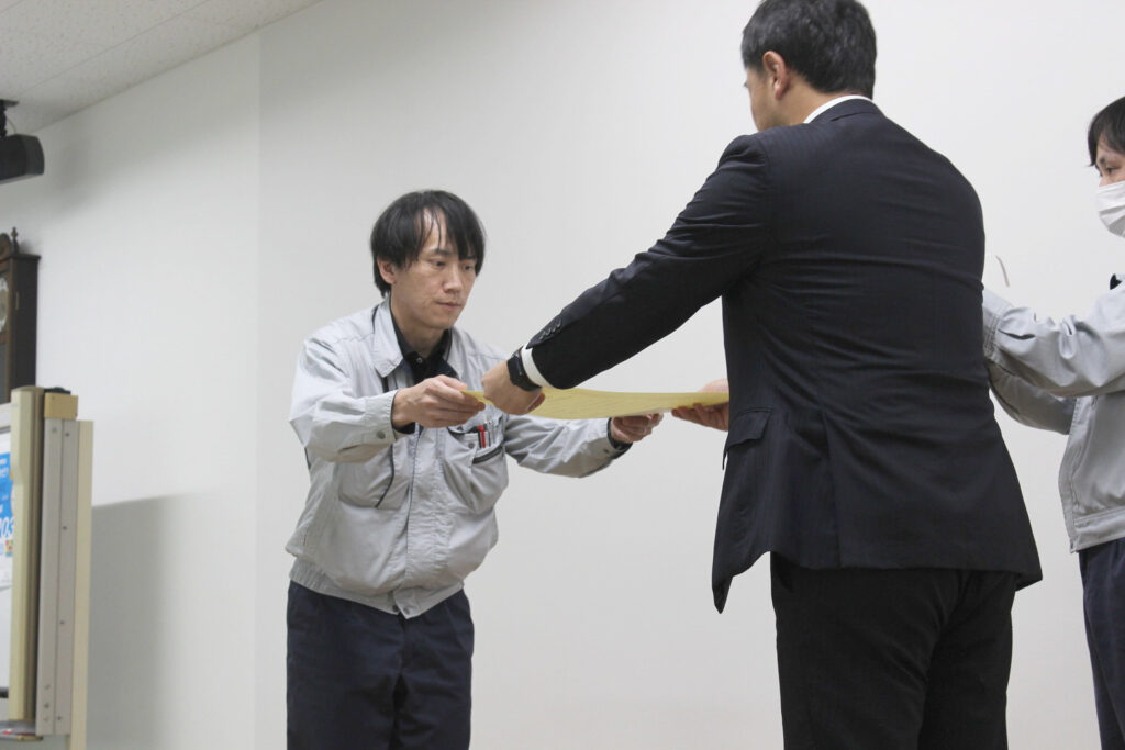 令和6年5月17日(金)、時津事業所にて、改善提案に関する社内フォーラムを開催しました。本フォーラムは、当期中に各社員から提出された数々の改善提案の中から、委員会の審査を経て選出された特に優秀な事例を発表するもので、今回が30回目の開催となります。「安全」、「品質」、「環境」、「DX」、「作業効率」、「コスト低減」等の観点から、職場の労働環境の改善や、生産性・顧客満足度の向上に資する様々なアイディアが捻出され、その中で高い評価を受けた事例・発案者に対し表彰が行われました。