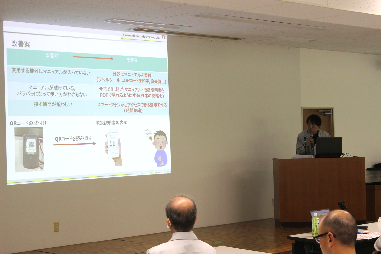 今回、30件の提案が表彰を受けることとなり、その内、最優秀賞(1件)、優秀賞(3件)、特別賞(1件)、努力賞(3件)、新人提案賞(1件)を受賞した9件の発表が行われました。最優秀賞の『使用工具取扱説明書(QRコード貼り付け)』は、作業で使用する機器・工具類に付随する紙媒体の説明書やマニュアルに関し、QRコードを印字したラベルシールを対象機器に貼り付けることで、スマートフォンによるPDF形式の説明書の読み取りを可能にし、閲覧を容易に、かつ探す時間の短縮化や紛失の防止を図るという事例でした。