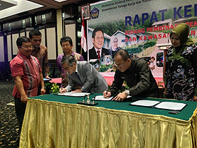 2013年11月8日、インドネシア共和国ジャカルタにて、当社が2011年に同国の南スマトラ州バニュアシン県(Banyuasin)の開拓村に設置した浄水装置(デモ装置)を、当地の労働移住省(Ministry of Manpower and Transmigration)へ譲渡することに合意する書類への調印式が行われました。 「浄水能力:6m3/day (塩分等を含む地下水を飲用レベルまで浄化します)」