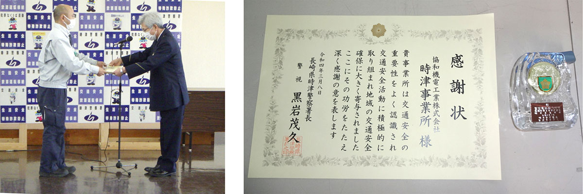 HOME > お知らせ一覧 > CSR活動 > 時津警察署より、当社の交通安全活動について感謝状を頂きました時津警察署より、当社の交通安全活動について感謝状を頂きましたby azborn2022年3月22日2022年3月22日当社時津事業所が、各季の交通安全運動において国道交差点で歩行者の保護誘導等、積極的に活動を行い、交通事故の抑制に貢献したとして、時津警察署より感謝状を頂きました。 今後もより一層、地域の安全・安心なまちづくりに貢献できるよう、活動を続けて参ります。