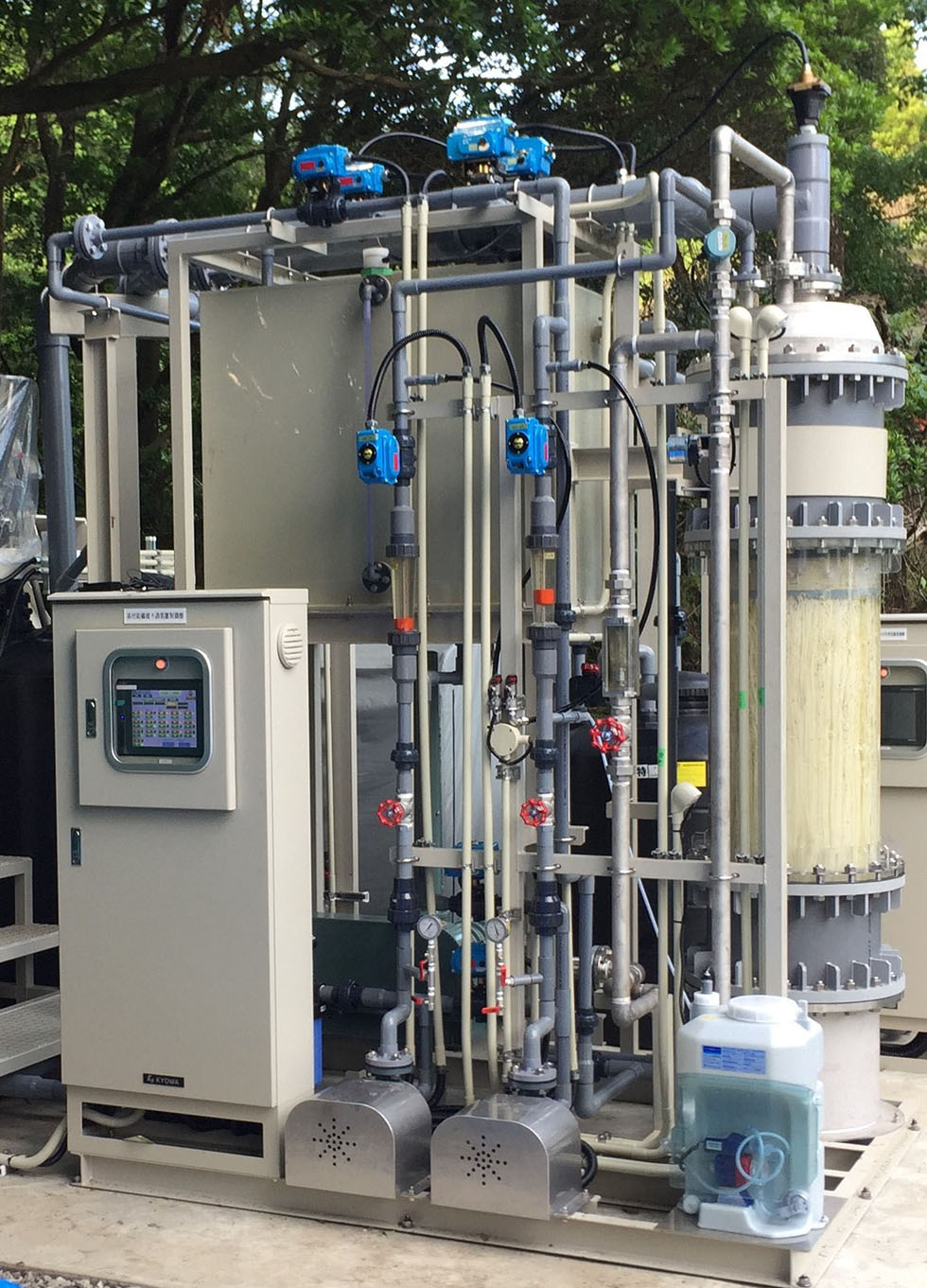 当社は、「高性能繊維ろ過装置F-CAP」を展示いたします。アクリル粒子を水中の濁質に見立てることで、微粒子除去効果を間近でご覧頂けます。お椀の形をしたCAPにより、ろ過の際は繊維を圧縮します。そのため、凝集剤を用いず、従来の繊維ろ過装置よりも良好な水質を出すことが出来ます。砂ろ過よりも、ろ過流速が4~8倍ほど速いため、省スペースで設置が可能です。今回の展示ではデモ機をご用意いたします。また併せて、福岡県の海水淡水化センター(まみずピア)の敷地内にて建設中のPRO(浸透圧発電)プラントのパネルや模型も展示いたします。