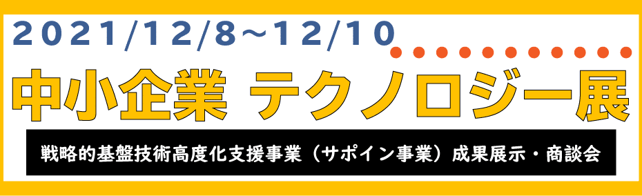 12月8日(水)から3日間に渡って東京ビッグサイトで開催が予定されている「中小企業 テクノロジー展」に出展いたします。本展示会は、中小企業庁「戦略的基盤技術高度化支援事業」(サポイン事業)に採択された事業者が当事業を通じて開発した新しい技術・製品等の販路開拓・拡大の取組を支援することを目的に開催されるものです。