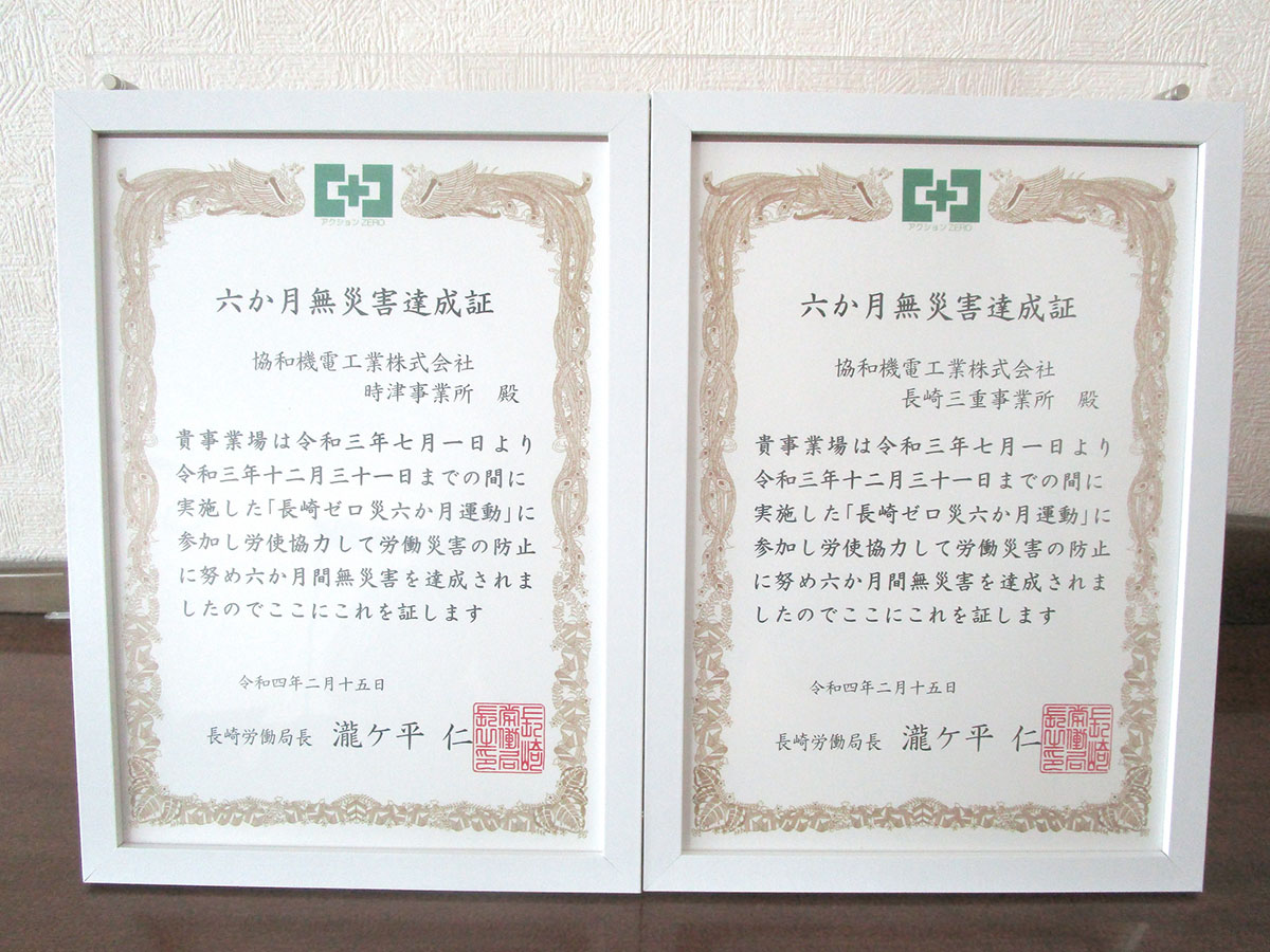 HOME > お知らせ一覧 > お知らせ > 長崎ゼロ災運動において「六か月無災害達成証」を交付されました長崎ゼロ災運動において「六か月無災害達成証」を交付されましたby azborn2022年3月24日令和3年7月1日から令和3年12月31日までの期間で実施された「長崎ゼロ災運動」に関し、当社時津事業所及び長崎三重事業所の二事業所それぞれにおいて六か月間無災害を達成したとして、長崎労働局より達成証を交付されました。 今後も災害防止に努め、安全な職場づくりを推進してまいります。