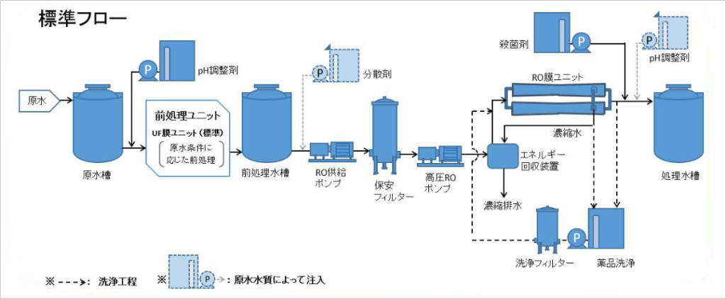 従来2段処理が必要であった逆浸透プロセスを1段処理としたことで、イニシャルコスト、ランニングコストを大幅に低減しました。