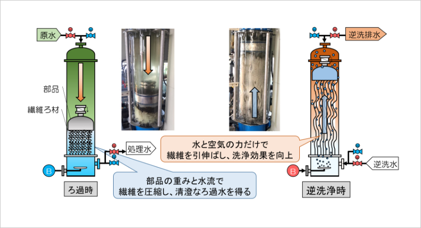 - 逆原水濁度100度まで対応可能で、濁質除去率を高く保つ独自のろ過内部構造を有する