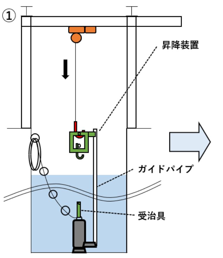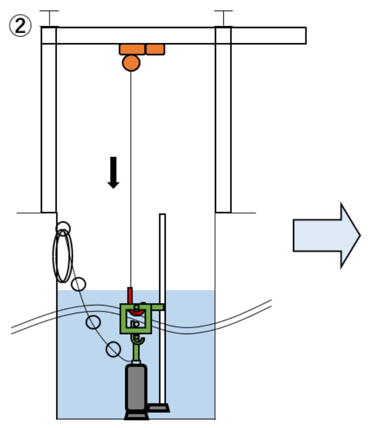①電動チェーンブロックで昇降装置を既設ガイドパイプに沿って水中へ降ろします。