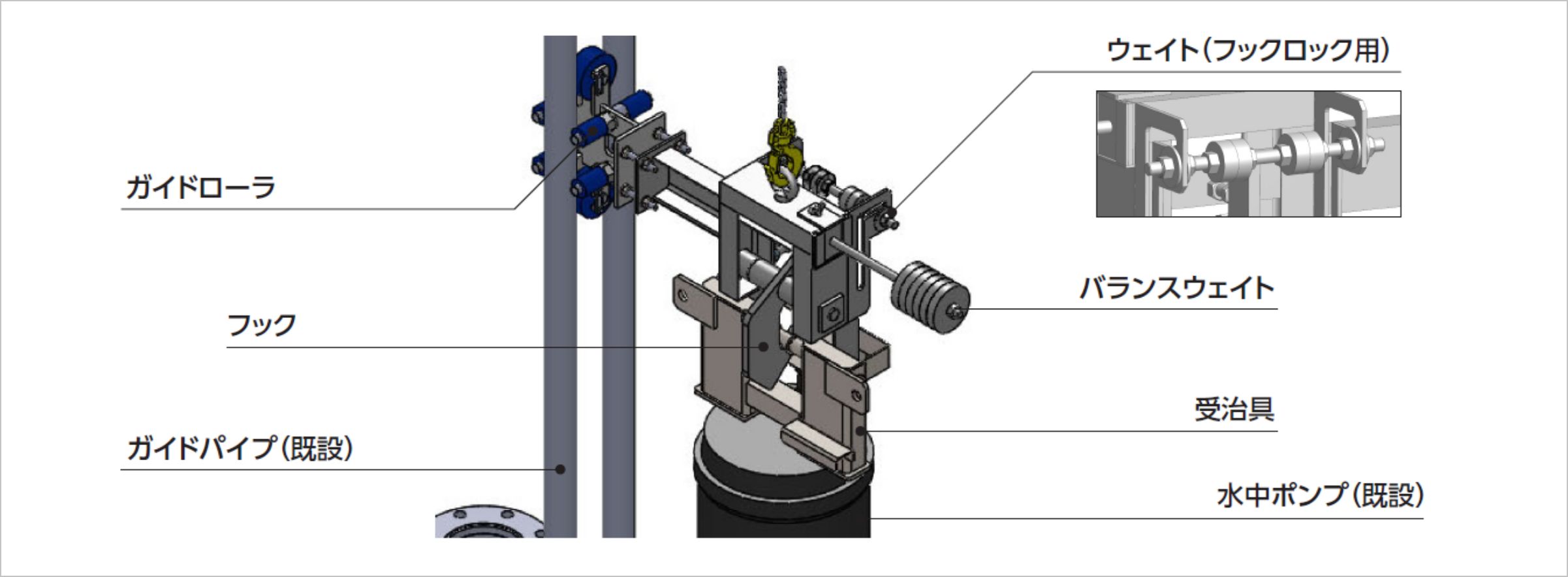 上・下水処理施設に設置されている着脱式水中ポンプの吊上げ・吊下げ作業が安全かつ効率的に実施できます。